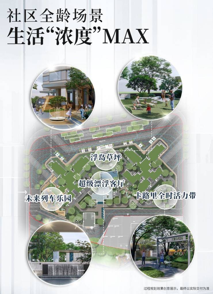 园区打造超级浮岛聚场,如未来列车乐园、浮岛草坪、卡路里全时休闲活力带和浮岛会客厅,赋能全龄生活新想象。