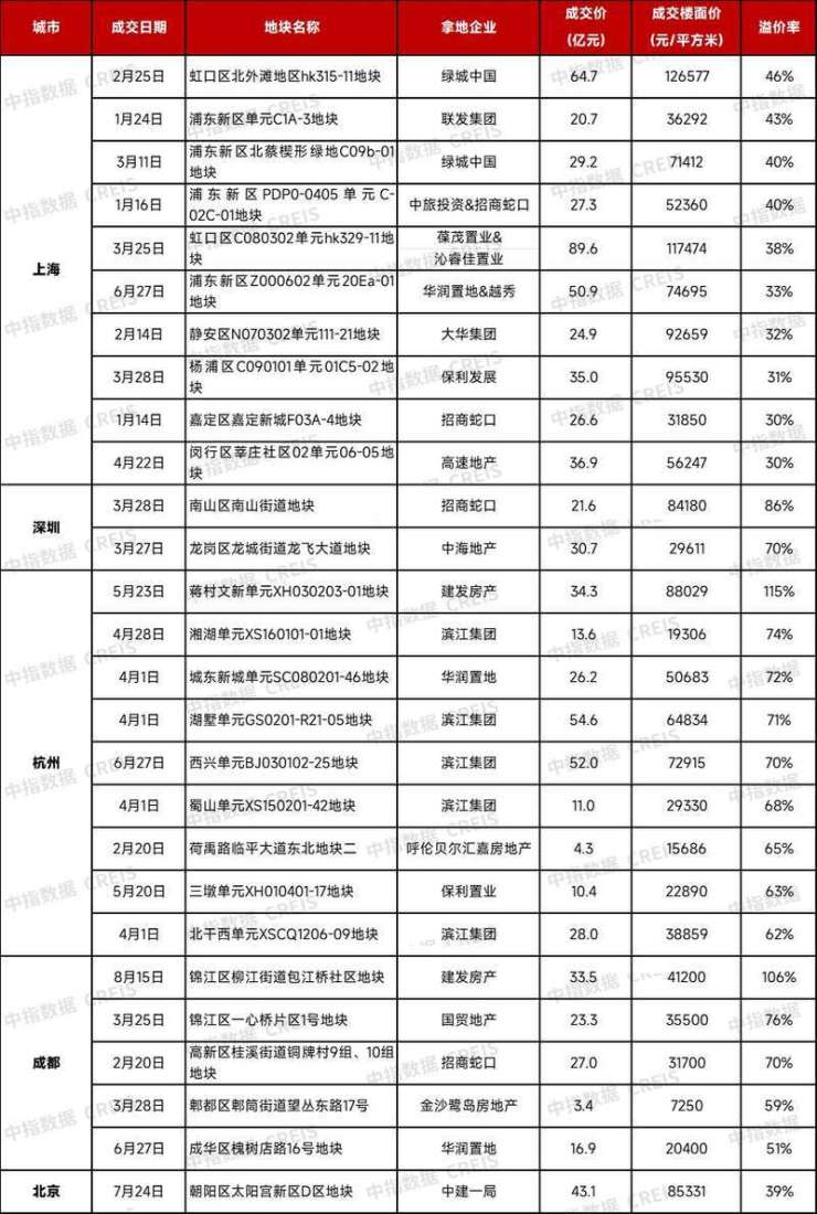 上海高溢价地块集中于虹口北外滩、浦东新区、静安、杨浦等城市核心区域。拿地企业包括绿城中国、招商蛇口、保利发展、华润置地等头部国央企。可见,对于上海,房企愿意支付高总价和高单价,但相比杭州,竞拍更偏向理性投资。