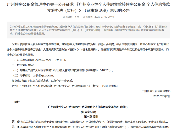 7月2日,广州住房公积金管理中心发布关于公开征求 《广州商业性个人住房贷款转住房公积金个人住房贷款实施办法(暂行)》(征求意见稿)意见的公告,拟面向在广州拥有唯一住房,且商业贷款已放款5年以上等,在原商业贷款银行同意后可转为纯公积金贷款。意见征求时间为2025年7月2日—7月11日。