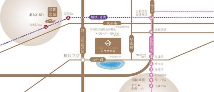 作为华南数字超级总部基地高端生态住区的代表作,鹏宸云筑距离10号线南坑站约600米,2站到福田孖岭,3站到深业上城,5站岗厦北;项目到深圳北站直线距离约2.7公里,可快速通达大湾区各地。