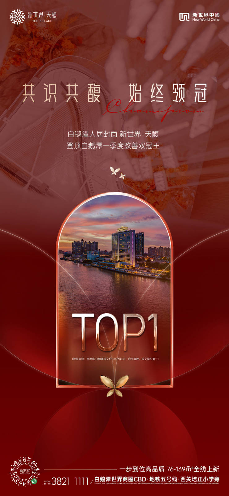 近日,随着一季度榜单揭晓,新世界·天馥再传捷报:继2025年揽下白鹅潭半壁江山成交后,再次斩获区域一季度成交套数、成交面积双冠王 (数据来源:克而瑞,单套成交金额1000万以内)。亮眼数据的背后,是项目“一步到位”底层置业逻辑与首期住宅高规格交付与兑现的双重叠加效应。