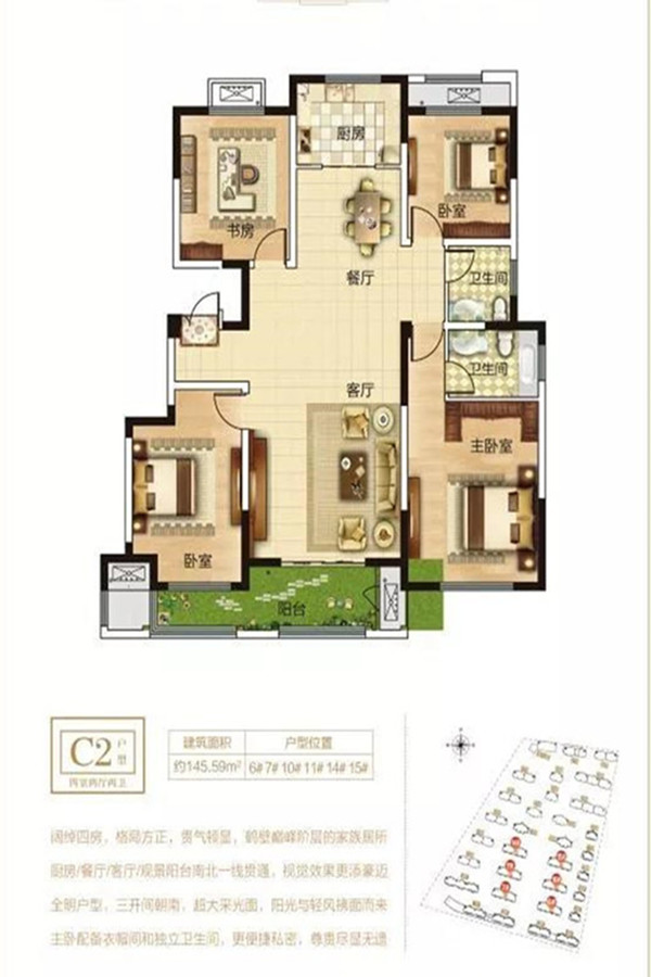 项目主要以洋房及小高层为主,建面约119-168㎡,整体户型方正,活动区域开阔,居住舒适度高;各部分空间均有窗,可保证整体空间采光和通风,居住舒适度好;整个户型空间布局合理,做到了干湿分离、动静分离,方便后期生活;客厅、卧室、卫生间和厨房等主要功能间的尺寸以及比例适中,有利于采光和通风,居住起来舒适、方便;公摊高于15%且低于25%,符合住宅公摊正常范围。