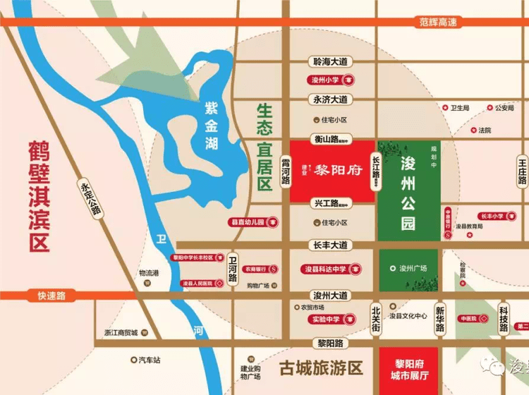 东邻800亩浚州公园,向西便是卫河沿岸景观带,政府规划的大型城市生态绿化湖景公园——紫金湖坐落于此,揽尽一城自然大美景色,致力于提升区域内的人居生活品质。