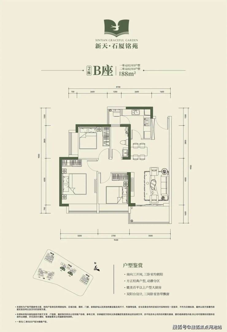 🔸2栋B座一单元02、03户型、2栋B座二单元02、03户型:面积约为88㎡的3房2厅1卫;