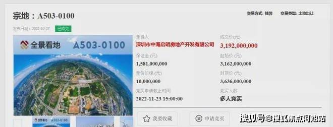 我们项目前身原为2022年第四批拍地,光明A503-0100宗地,经过多轮角逐,最终由中海以31.92亿拍下该宗地,项目普通商品住房平均销售价格不高于48900元/平方米(不含室内装修价格),安居型商品房平均销售价格不高于23400元/平方米(不含室内装修价格)、最高销售价格不高于24600元/平方米(不含室内装修价格)