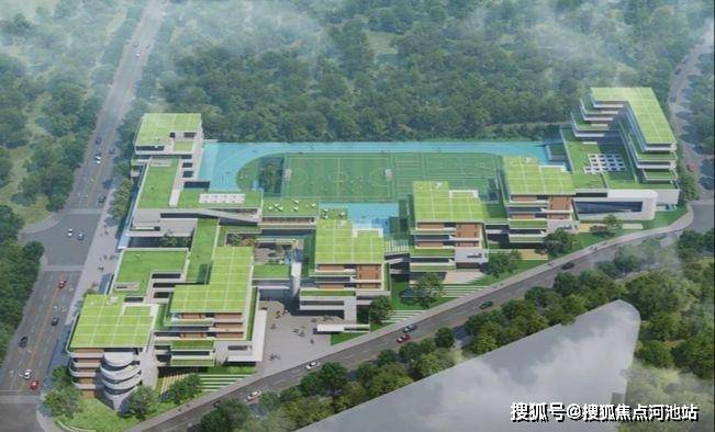 新建54班九年一贯制学校,提供2520个学位,包含初中部、小学部、体育馆、教师宿舍、图书馆与报告厅、餐厅等。
