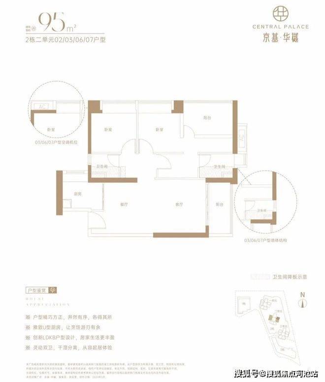 仅2栋2单元05户型才有,设计的是经典竖厅格局,LDKB一体化,动静分区,四开间朝南,U型厨房,卫生间干湿分离,得房率约73%(不含赠送),阳台西南朝向。