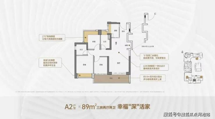 89㎡的3房2厅2卫,A2户型,设计的是竖厅格局,客厅3.5米开间,LDKB一体化,S墙设计预留冰箱卡槽位,客厅连接次卧出5.9米长的大阳台,次卧270度转角飘窗,U型厨房,卫生间干湿分离,阳台有朝西向、东向、南向。