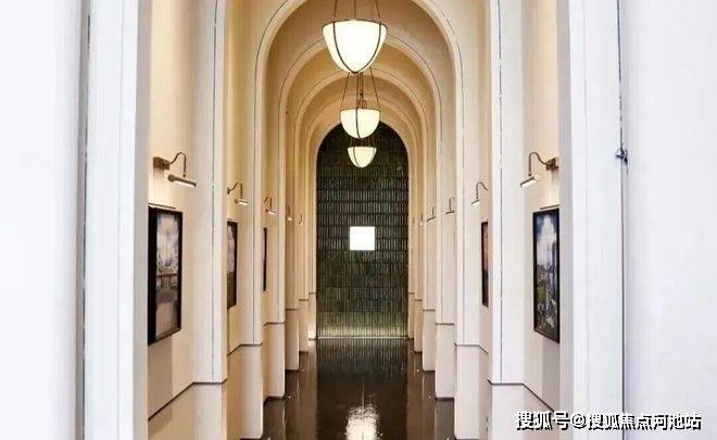 主入口外场是酒店式落客区围合空间,中间是开敞大气的跃升式入口,两侧运用维纳多石材铺贴,公区整体质感突出。