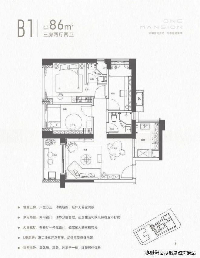 86㎡的3房2厅2卫,设计的竖厅格局,餐客厅一体化设计,三开间朝南,L型厨房,得房率72.47%(不含赠送),西南朝向。