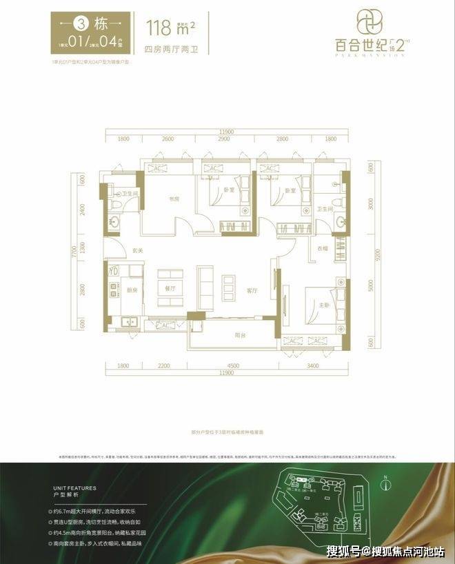 118㎡的4房2厅2卫,3栋1单元04/3栋2单元01户型,设计的是竖厅南北通透格局,进门入户玄关,客厅4.15米开间,客餐厅分离设计,南北双阳台,四开间朝南,分别做到了主卧16.5㎡/次卧11.1㎡/次卧9.57㎡/次卧8.25㎡(包含墙体飘窗),U型厨房,卫生间干湿分离,得房率约76.2%(不含赠送),阳台主朝西南或东南向。套内面积89.55㎡+赠送15.44㎡=104.99㎡,加上赠送得房率约89.37%。