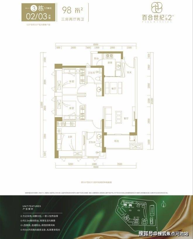 98㎡的3房2厅2卫,3栋02/03户型,设计的是竖厅格局,进门入户玄关客厅3.5米开间,LDKB一体化设计,三开间朝南,动静分区,分别做到了主卧14.46㎡/次卧9.6㎡/次卧8.32㎡(包含墙体飘窗),L型厨房带1个生活阳台,公卫三段式干湿分离,得房率约76.2%(不含赠送),正南朝向。套内面积74.69㎡+赠送9.05㎡=实得83.74㎡,加上赠送得房率约85.46%。