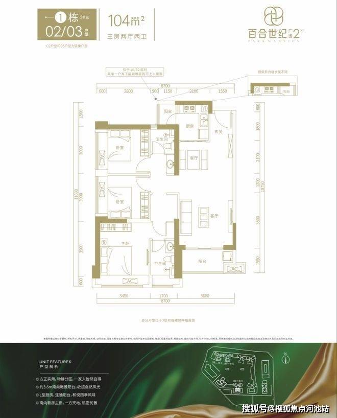 104㎡的3房2厅2卫,1栋02/03户型,设计的是竖厅格局,客厅3.6米开间,LDKB一体化设计,三开间朝南,动静分区,分别做到了主卧15.81㎡/次卧10.2㎡/次卧10.2㎡(包含墙体飘窗),L型厨房带1个生活阳台,公卫三段式干湿分离,得房率约76.9%(不含赠送),正南朝向。套内面积79.76㎡+赠送10.31㎡=实得90.07㎡,加上赠送得房率约86.8%。
