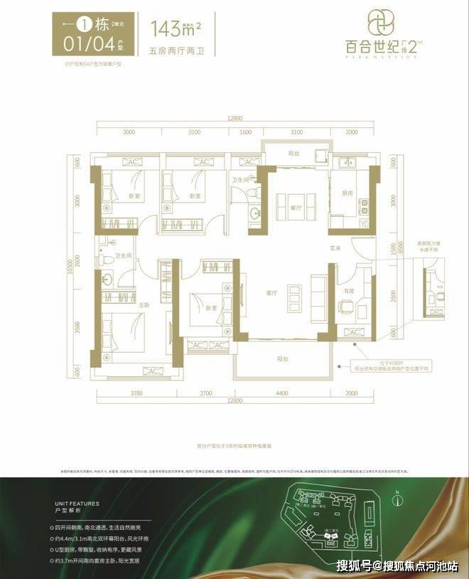 143㎡的5房2厅2卫,3栋1单元04/3栋2单元01户型,设计的是竖厅南北通透格局,进门入户玄关,客厅4.4米开间,客餐厅分离设计,南北双阳台,四开间朝南,分别做到了主卧17.77㎡/次卧11.16㎡/次卧10.8㎡/次卧10.8㎡/次卧6.8㎡(包含墙体飘窗),U型厨房,卫生间干湿分离,得房率约76.9%(不含赠送),阳台主朝西南或东南向。套内面积109.52㎡+赠送17.22㎡=实得126.74㎡,加上赠送得房率约88.94%。