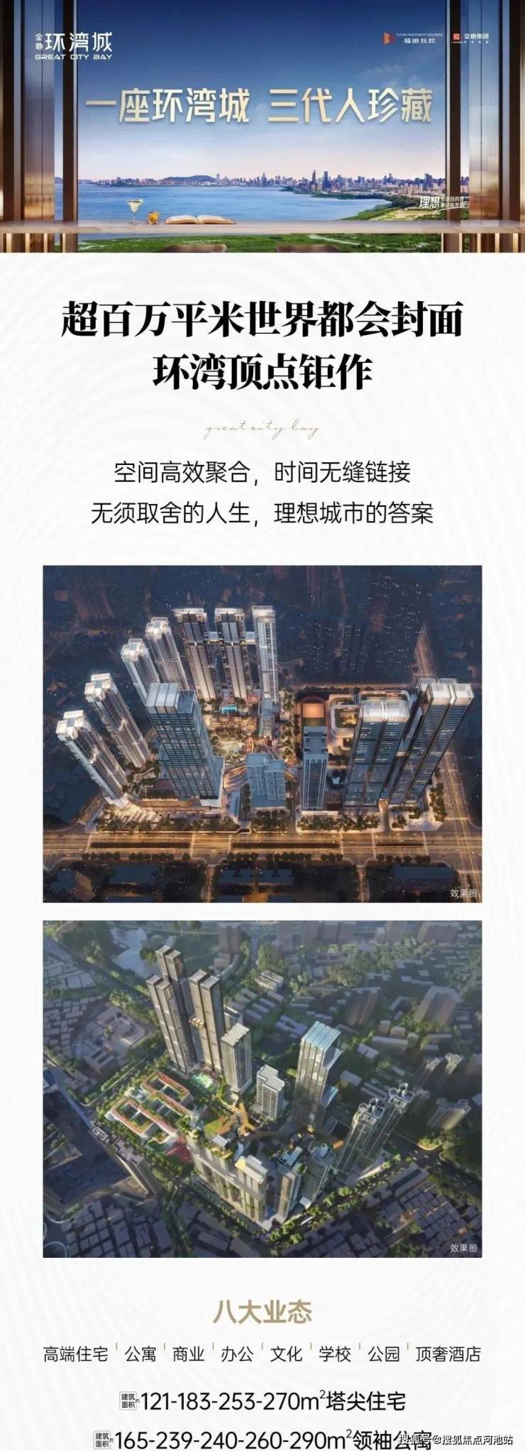 金地环湾城项目是由深圳市福田区政府全资企业福田投控与金地集团联袂打造,是深圳福田核心区罕见的百万方城市综合体(总建面103万㎡)。项目聚合八大高端业态:塔尖住宅、领袖公寓、红岭名校、嘉佩乐隐奢酒店、商务地标、绿地公园、漫调商业、文化艺术,致力于打造“理想生活目的地”与“事业始发站”。