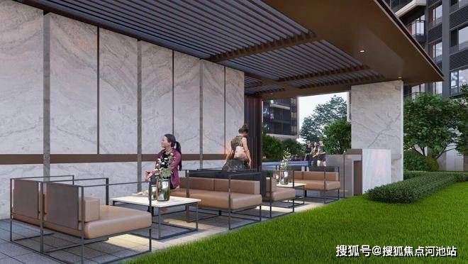 以社区活力厅为例,廊架结合景观会客、泛大堂空间、室外吧台、林下木质平台,给人才圈层的业主们提供社交空间的同时,以一步一景为筑景标准,造就园区大美景观。