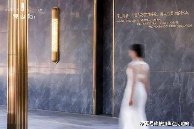 入口大景墙全部采用温德姆灰石材,搭配普拉达绿大理石,还有用金属壁灯和金丝网垂缦装点的通道,是独属于观山海家园业主的尊贵归家礼序。