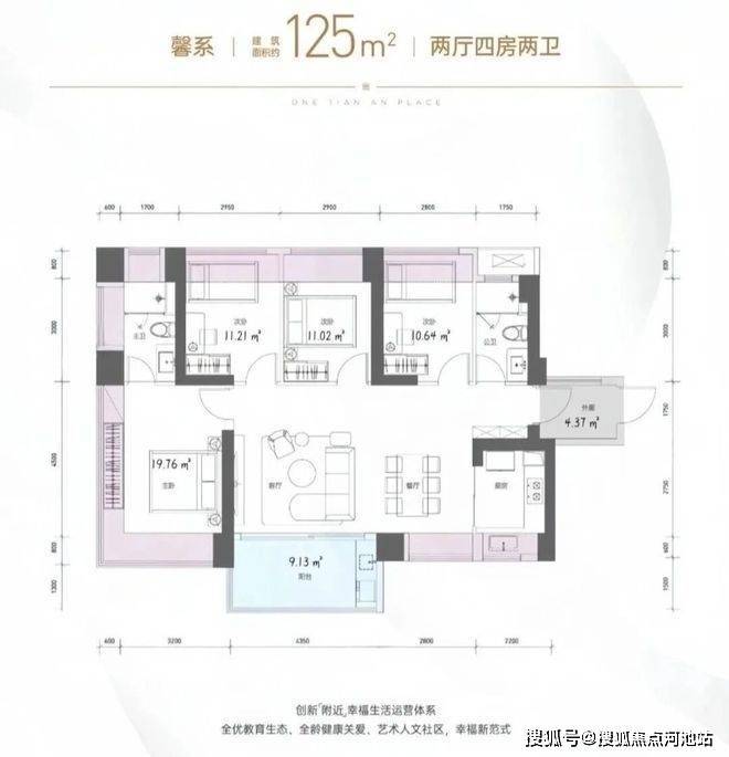 125㎡的4房2厅2卫,2栋2/3单元01户型,设计的是横厅南北通透格局,独门独户,赠送约4.37平的入户空间,客餐厅7.15米开间,LDKB一体化设计,四开间朝南,分别做到了主卧19.76㎡/次卧11.21㎡/次卧11.02㎡/次卧10.64㎡(包含墙体飘窗),客厅出阳台约9.13平,U型厨房,卫生间干湿分离,得房率约99.29%(包含赠送),西南朝向。飘窗赠送面积15.18㎡+阳台赠送4.56㎡+外廊赠送4.37㎡=实际赠送24.11㎡。