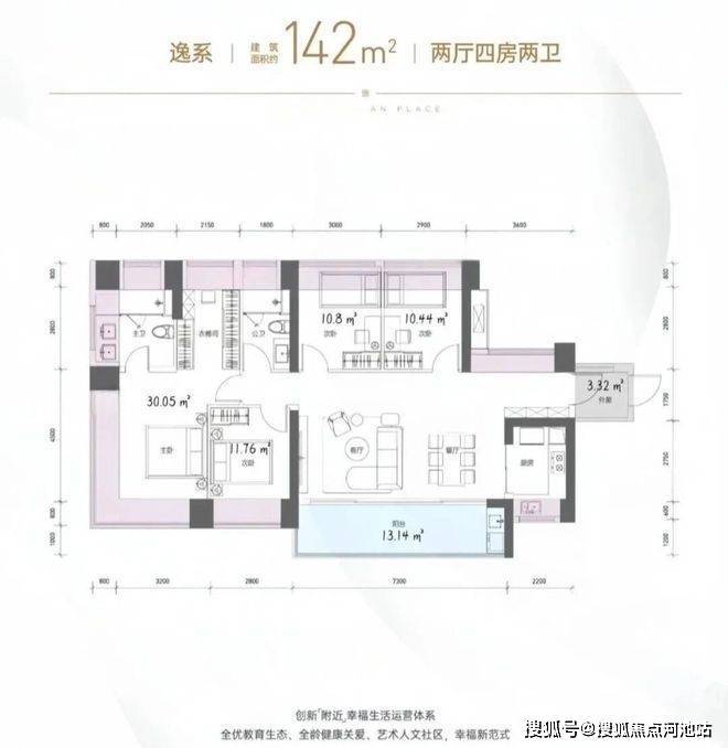 142㎡的4房2厅2卫,1栋2单元05户型/2栋1单元01户型,设计的是横厅南北通透格局,独门独户,赠送约3.32平的入户空间,客餐厅7.3米开间,LDKB一体化设计,五开间朝南,主卧带大衣帽间,分别做到了主卧30.05㎡/次卧11.76㎡/次卧10.8㎡/次卧10.44㎡(包含墙体飘窗),客厅连接餐厅出7.3米长的大阳台约13.14平,U型厨房,卫生间干湿分离,得房率约103.95%(包含赠送),西南或东南朝向。飘窗赠送面积24.12㎡+阳台赠送6.57㎡+外廊赠送3.32㎡=实际赠送34.01㎡。