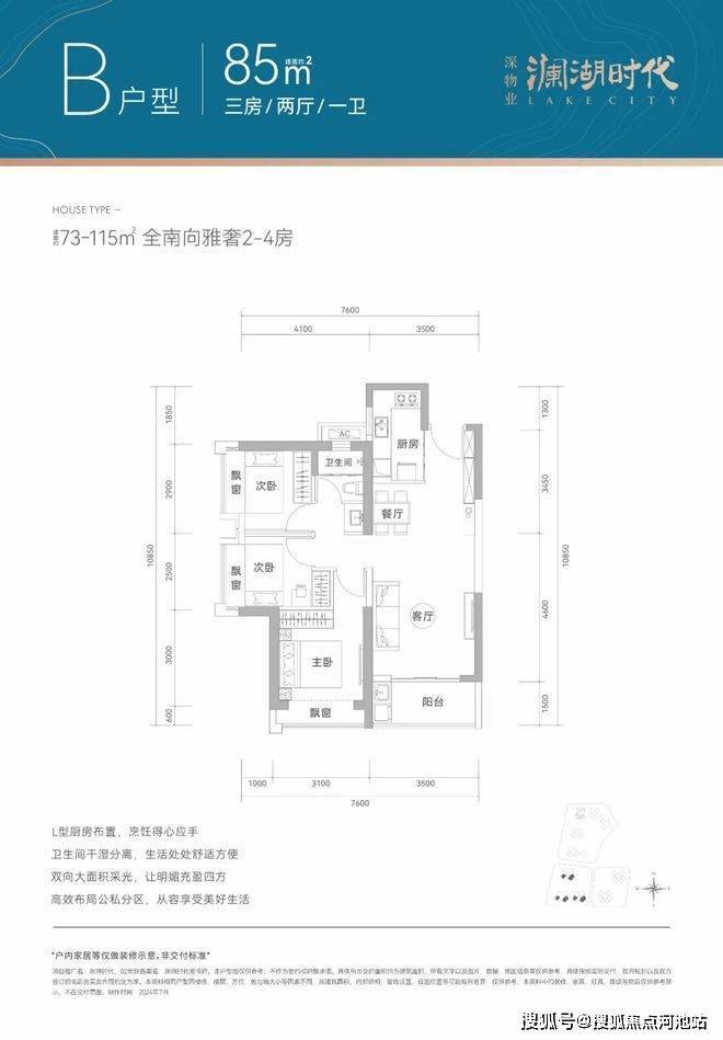 85㎡的3房2厅1卫,设计的是竖厅格局,客厅3.5米开间,LDKB一体化设计,3个卧室分别做到了3.1米/2.9米/2.5米的宽度,L型厨房,卫生间三段式分离,得房率77-78%(不含赠送),阳台西南或东南朝向。