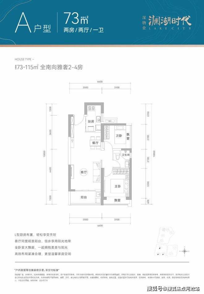73㎡的2房2厅1卫,设计的是竖厅格局,客厅3.5米开间,LDKB一体化设计,2个卧室分别做到了3.1米/2.7米的宽度,L型厨房,卫生间干湿分离,得房率77-78%(不含赠送),阳台都是西南朝向。