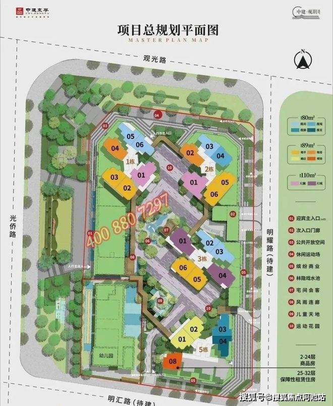 中建观玥总占地面积约1.43万㎡,总建筑面积约11.49万㎡,计容建筑面积约7.91万㎡,容积率5.4,绿化率35.1%,共由4栋总高32-33F住宅组成,其中1/2/3栋商品房33F,5栋商品房+保障房32F,4栋是1所6班制幼儿园。