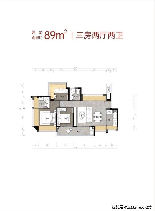 89㎡的3房2厅2卫,设计的是竖厅格局,客厅3.4米开间,LDKB一体化,S墙设计预留冰箱卡槽位,3个卧室分别做到了3.9米/2.9米/2.6米的宽度,客厅连接次卧出6.3米长的大阳台,L型厨房,卫生间干湿分离,有西北、西南或东南朝向。