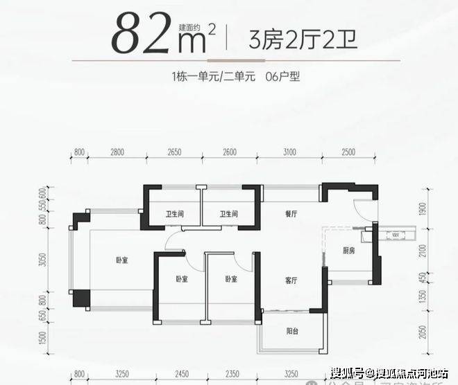 82㎡的3房2厅2卫,06户型,设计的是竖厅南北通透格局,进门独立玄关,LDKB一体化,主卧270°飘窗设计,U型厨房,卫生间干湿分离,得房率约98%(包含赠送),阳台主朝西北向。