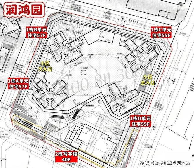 后面要入市的润鸿园,总占地面积约2.1万㎡,总建筑面积约25.97万㎡,计容建筑面积约19.3万㎡,容积率8.33,绿化率30.01%,共由4栋总高55-57层高的住宅组成,其中1栋A/B单元住宅57F,1栋C/D单元住宅55F,2栋是写字楼40F,是独立于小区之外的。