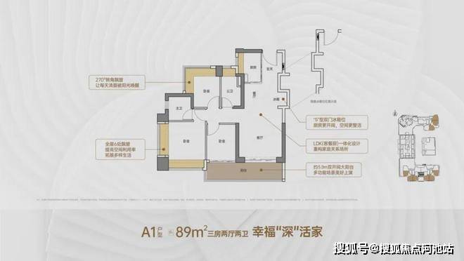 89㎡的3房2厅2卫,A1户型,设计的是竖厅格局,客厅3.5米开间,LDKB一体化,S墙设计预留冰箱卡槽位,客厅连接次卧出5.9米长的大阳台,主卧双面飘窗,次卧270度转角飘窗,U型厨房,卫生间干湿分离,阳台有朝西向、东向、南向。