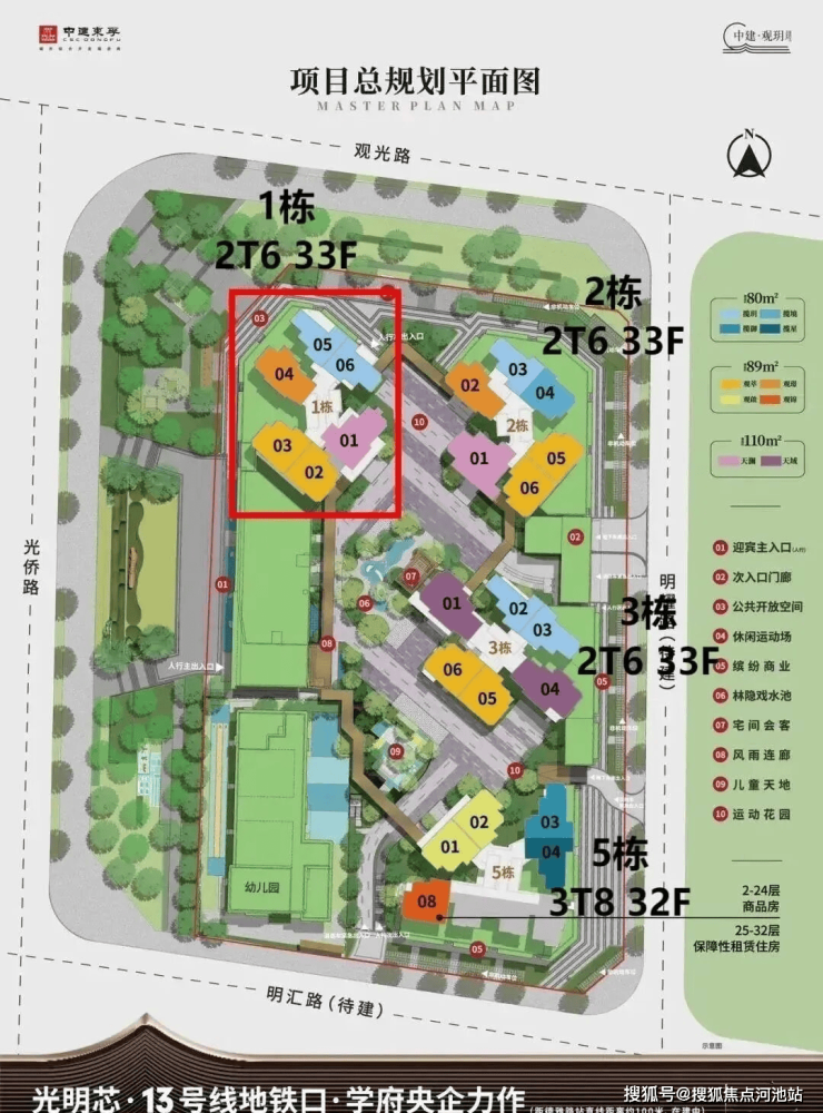 规划:项目占地约1.43万㎡,建筑面积约7.91万㎡,容积率5.4。由4栋总高32-33F住宅组成,共820套80-110㎡3-4房,停车位898个,车位比1:1.1。