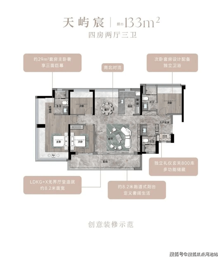 ✅ 133㎡4房3卫,折后总价及单价未明确,备案总价332-588万/套、备案单价4.03-4.42万/㎡,户型设计与117㎡类似,少量供应。