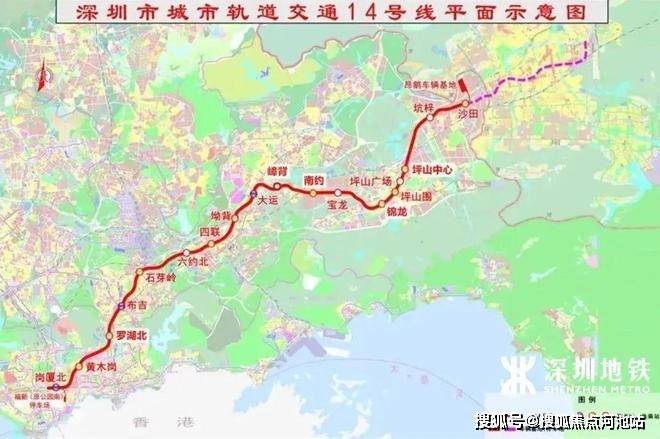 14号地铁线,该线路是从坪山沙田开往福田岗夏北的快速线,设计时速120公里,4站到大运,9站到布吉,10站到罗湖,12站到福田岗厦北,用时43分钟。
