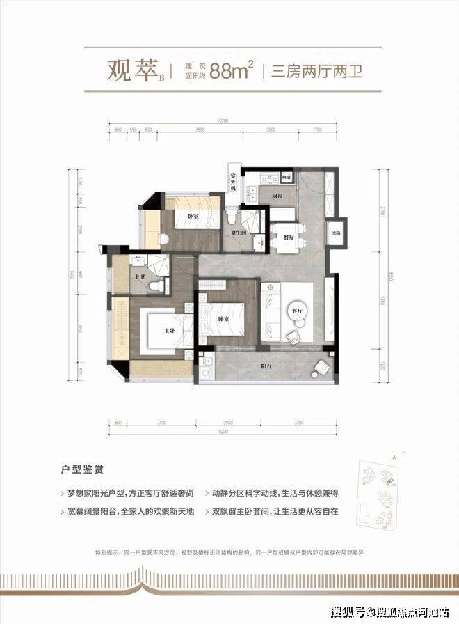 89m²的3房2厅2卫,折后总价335-375万/套,单价3.8-4.28万/m²