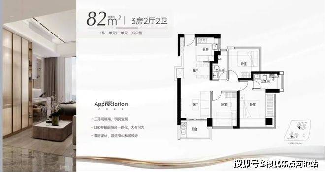 82㎡的3房2厅2卫,03户型,设计的是竖厅格局,进门独立玄关,LDKB一体化,S墙设计预留冰箱卡槽位,主卧双飘窗设计,L型厨房,卫生间干湿分离,得房率约98%(包含赠送),西南朝向。