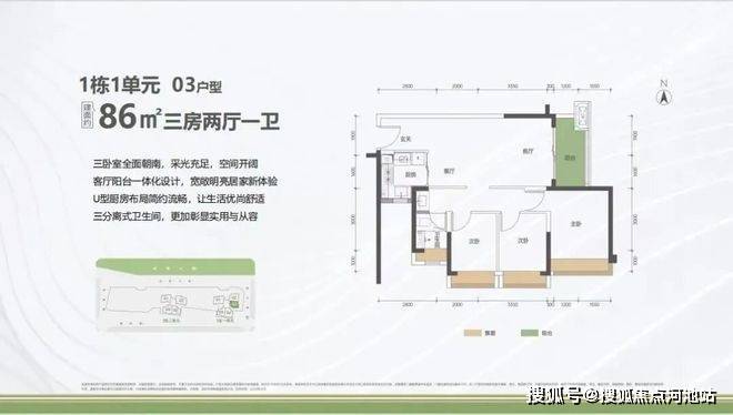 竖厅格局,客厅3.5米开间,LDKB一体化设计,进深11.31米,动静分区,三卧室朝东北向看科学公园,二字型厨房还带1个生活阳台,公卫三段式分离,阳台1.5米进深,东南朝向,加上赠送后得房率约92.7%。