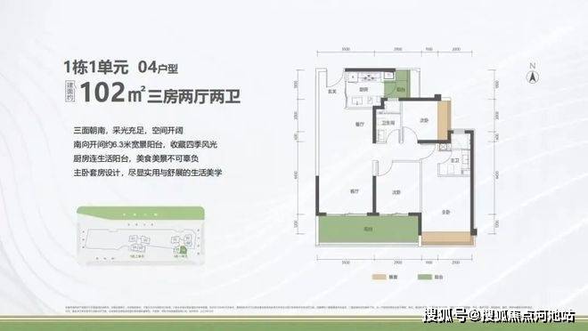 竖厅南北通透格局,进门入户玄关,客厅3.6米开间,餐客分离,餐厨一体设计,四开间朝南,主卧套房带阳台,客厅连接次卧出5.8米长的巨幕大阳台,U型厨房,卫生间干湿分离,阳台主朝东北向看科学公园,加上赠送后得房率约94.37%。