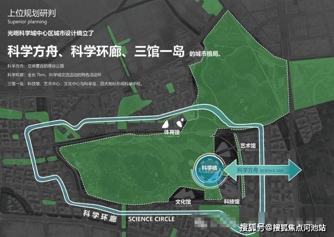光明科学城是光明的核心战略,占地99平方公里,占据了光明区约60%的面积,相当于南山科技园的9倍。其整体空间规划为“一心两区 绿环萦绕”。
