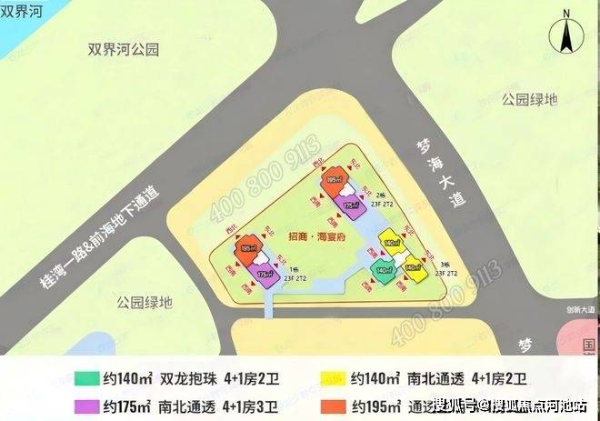 景观与配套兼备:北向瞰双界河景,西北向直面 “湾区之光” 摩天轮及海景,部分户型南北通透;步行可达前海湾地铁站(1/5/11 号线),邻近万象前海、壹方城等商业体,周边公园环绕,西侧规划九年一贯制学校,生活、教育资源丰富。