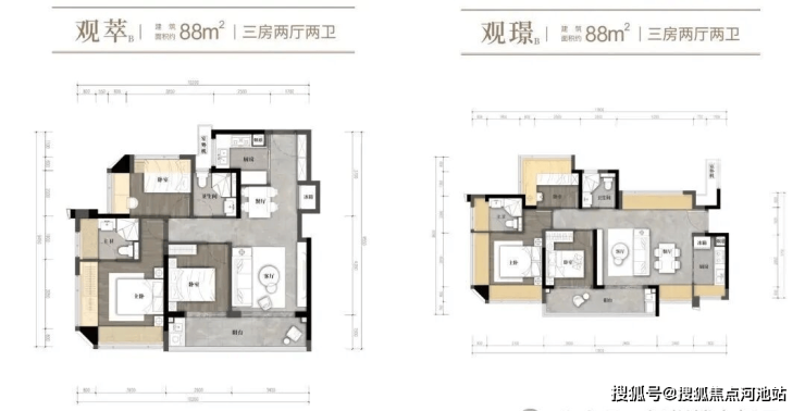 比如建面约88平观萃户型,竖厅3房2厅2卫,格局方正、动静分区,客厅+卧室出阳台。