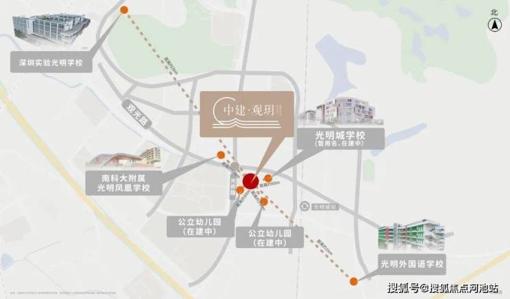 中建观玥项目位于光明凤凰城片区,作为深圳市首批重点发展之一,集萃一城精华的行政、人文、商业、生态等全维资源。位于6号线光明城站和13号线同观路站中间,目前正处于基坑状态。一路之隔是九年一贯制学校光明城学校(深实验光明科林部),东侧为中海时光境花园、南边是华润润曜府及润晖府。
