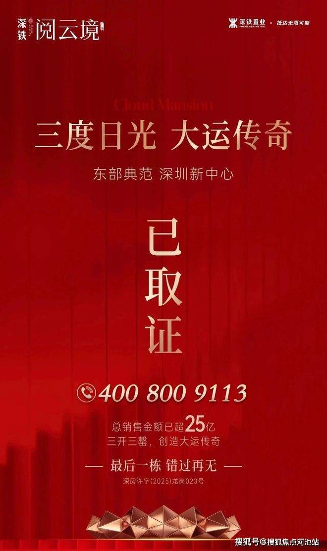 深圳龙岗大运【深铁阅云境】即将加推最后一栋商品房4单元!面积100-104㎡,全部为三房户型,总高46层,3梯6户,246户,已开放开放实体样板房!参观需要提前来电预约,项目已于2025年12月12日取证,12月21号正式开盘!
