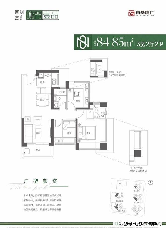 84㎡的3房2厅2卫,设计的是经典竖厅格局,进门入户玄关,客厅3.5米开间,LDKB一体化设计,动静分区,主卧+1个次卧270°飘窗,U型厨房,卫生间干湿分离,得房率:71.29%(不含赠送),西南或西北朝向。
