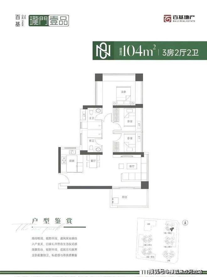 104㎡的3房2厅2卫,设计的是经典竖厅格局,进门入户玄关,客厅4.375米开间,LDKB一体化设计,动静分区,四开间朝南,主卧三面飘窗,U型厨房,卫生间干湿分离,得房率:71.29%(不含赠送),西南朝向。