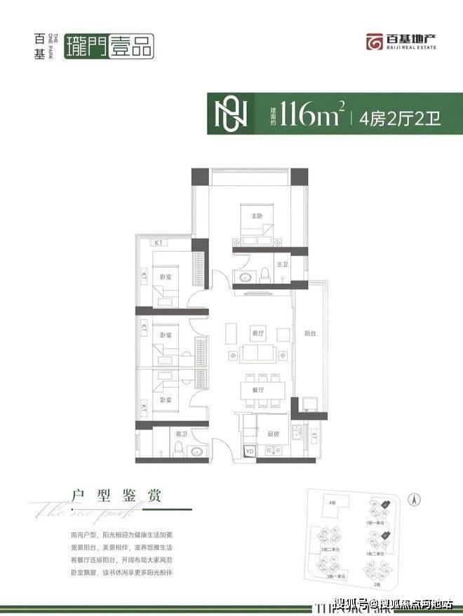 116㎡的4房2厅2卫,设计的是横厅南北通透格局,进门入户玄关,客餐厅6米开间,LDKB一体化设计,五开间朝南,4个卧室分别做到了3.775米/3.2米/2.6米/2.575米的宽度,主卧三面飘窗,6米长的大阳台,L型厨房,卫生间干湿分离,得房率:70.65%(不含赠送),阳台主朝东南向。