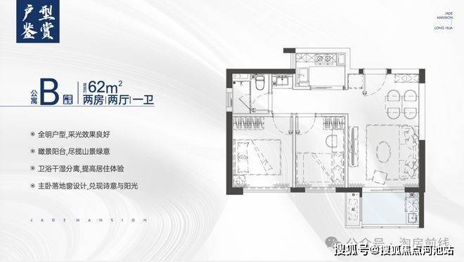户型面积为47㎡一房两厅一厨一卫,62㎡二房两厅一厨一卫,户型非常方正实用。