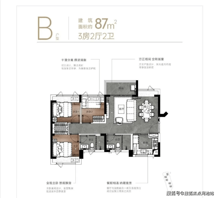 87㎡的3房2厅2卫,折后总价约265万起,单价约3.04万/㎡。