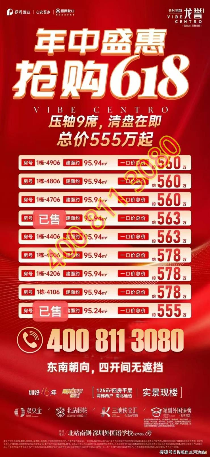 深圳龙华【保利招商龙誉】清盘倒计时,目前清盘面积段为1栋的95平横厅带精装修3房最后8套小户型,除此外还有北站唯一小高层板楼125㎡,总价825-850万左右!现房在售即买即住,本次推售房源最低总价约560万起!