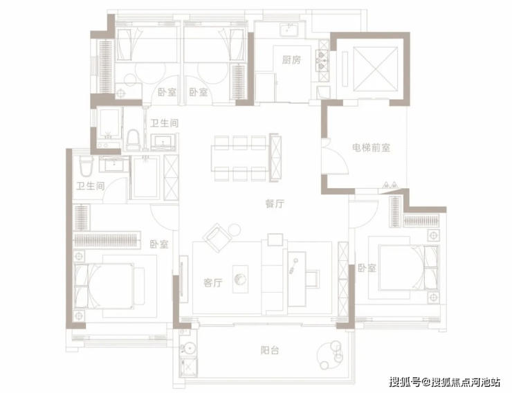 125㎡奢阔大平层,独梯入户,营造归家仪式感南北通透三面采光,超长横厅享南向观景阳台