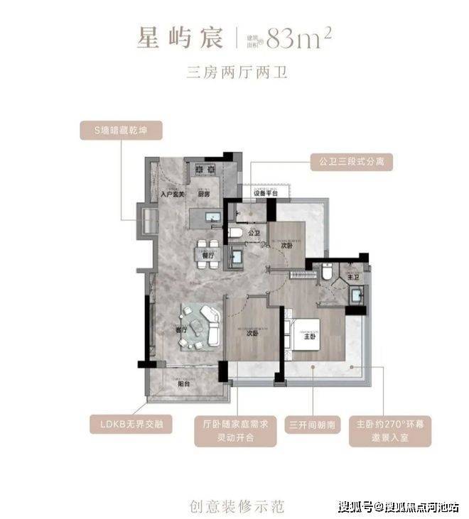 83㎡的3房2厅2卫,设计的是经典竖厅格局,客厅3.35米开间,LDKB一体化,S墙设计预留双开门冰箱卡槽位,三开间朝南,动静分区,U型厨房,公卫三段式干湿分离,赠送1.98平设备平台,得房率约77.15%(不含赠送),阳台5.02m²西南或东南朝向。靓点:83平做到了3房2卫,主卧270°无柱转角飘窗,厨房烟道外置+额外赠送设备平台,并且是纯南向格局。